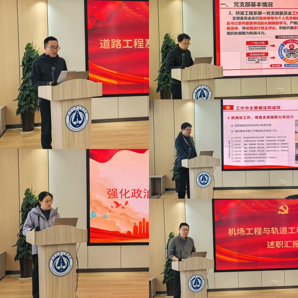 道路一支部、桥梁一支部等5个支部书记依次作现场述职,其余5个支部书记提交书面述职报告。现场述职的支部书记紧扣党建主责主业,全面总结2025年支部党建工作成效,深刻查摆工作中存在的问题与不足,并提出针对性整改思路和下一步工作计划,重点突出、务实高效。述职结束,参会人员结合现场述职、书面报告及日常工作了解情况,对全体教工党支部开展现场民主测评。