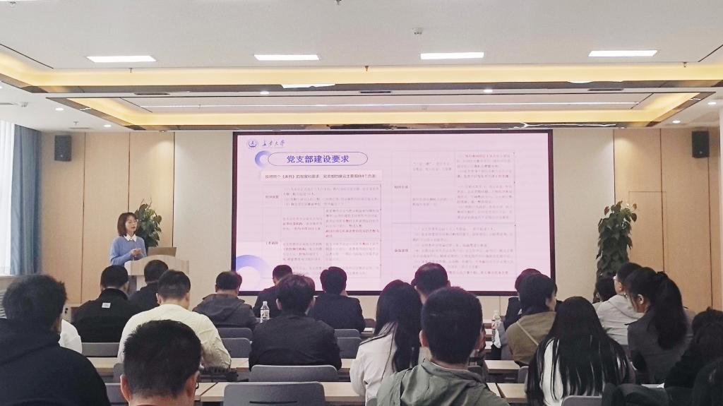 郭洋结合《中国共产党支部工作条例(试行)》《中国共产党普通高等学校基层组织工作条例》等文件精神和学校相关工作要求,就学院党建基本情况、党支部建设要求、党建工作实务、党费收缴使用管理等内容展开讲解。重点从组织设置、工作机制、组织生活、队伍建设四个维度阐释党支部标准化规范化建设要求,明确党支部要紧扣“七个有力”建设标准,严格落实“三会一课”、主题党日、组织生活会、民主评议党员等制度,推动党建工作与教学科研、师德师风、人才培养深度融合。同时,对发展党员、党员管理、党费核算与使用、会议记录规范等日常党务工作进行实操讲解,助力新任支委快速熟悉业务、掌握工作方法。